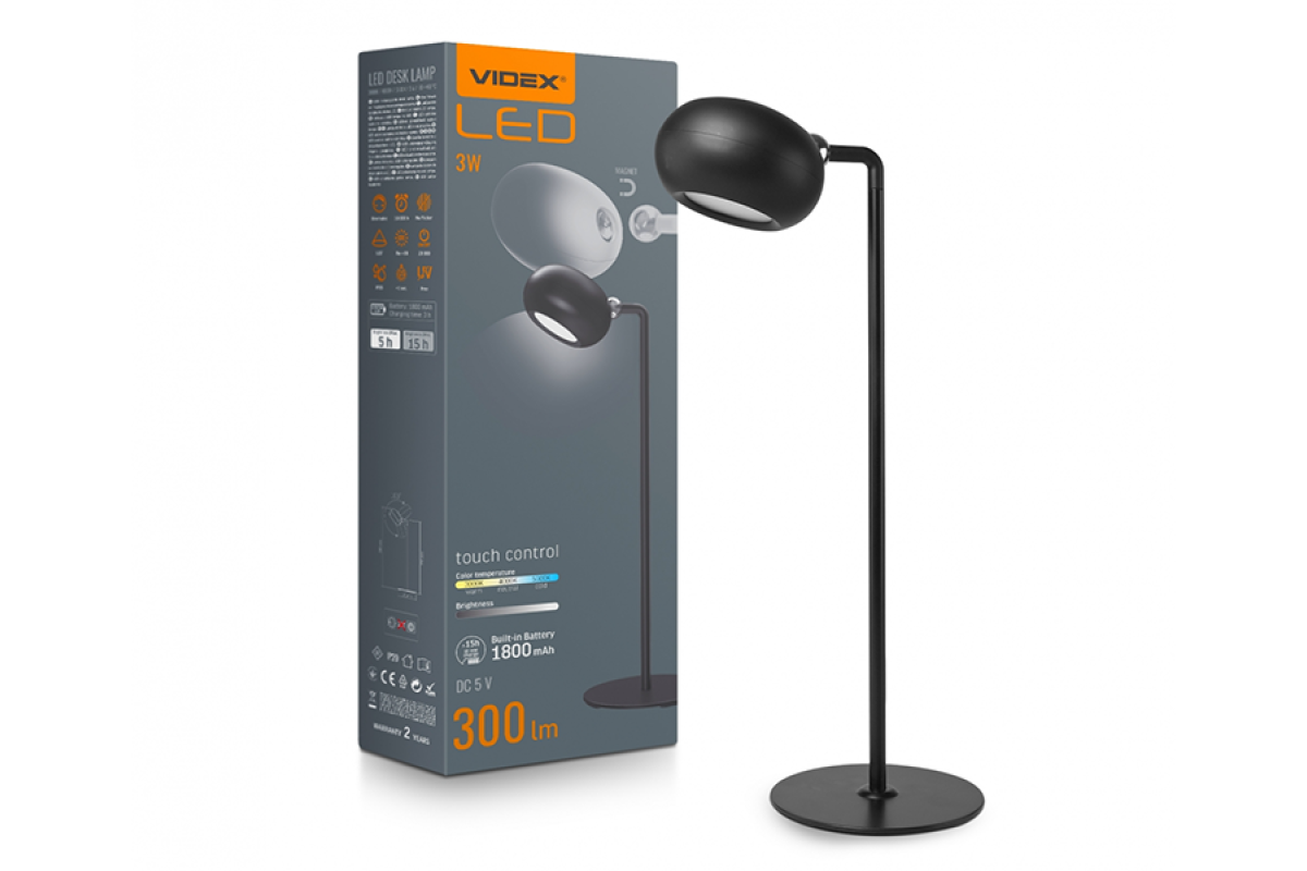 Desktop rechargeable lamp 3W 5V 3000-5500K black (VLE-TF18B) VIDEX
