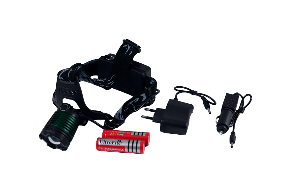 Headlamp rechargeable, charger 220V, cigarette lighter 2188-T6, microUSB power supply, 2*18650, zoom