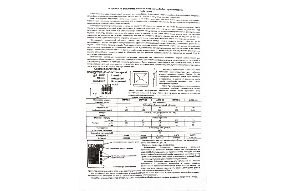 LED floodlight 30W RGB+remote control IP65 170-240V black LMP76-30 RGB Lemanso