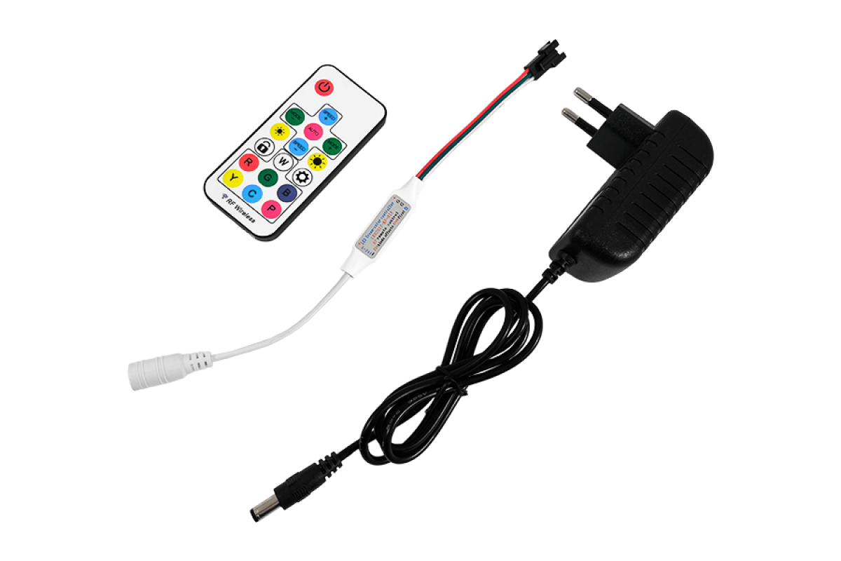 5 m ribbon cable, 12 V 1 A power supply, controller, remote control