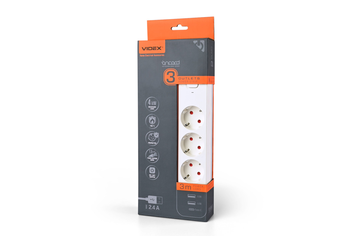 Мережевий подовжувач VIDEX ONCORD з/з 3п 3м (3x1.5мм) 2.4А 2USB+USB-C з кнопкою White