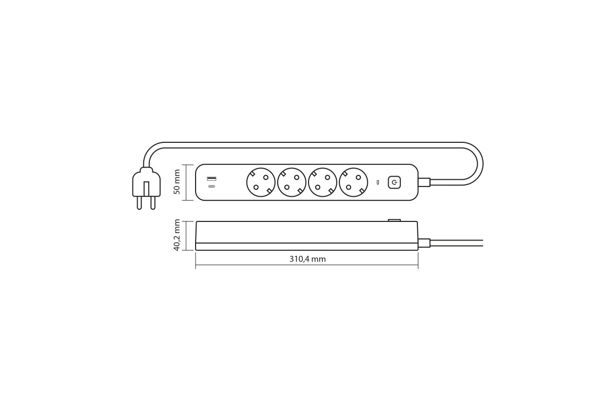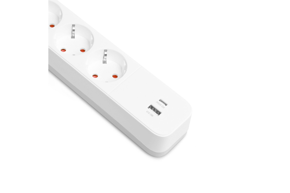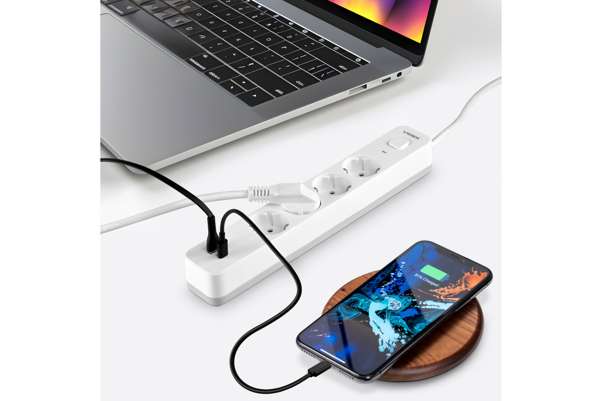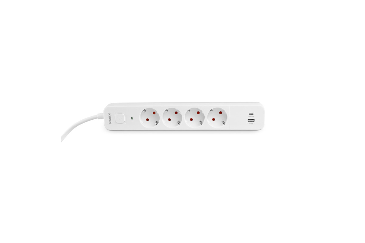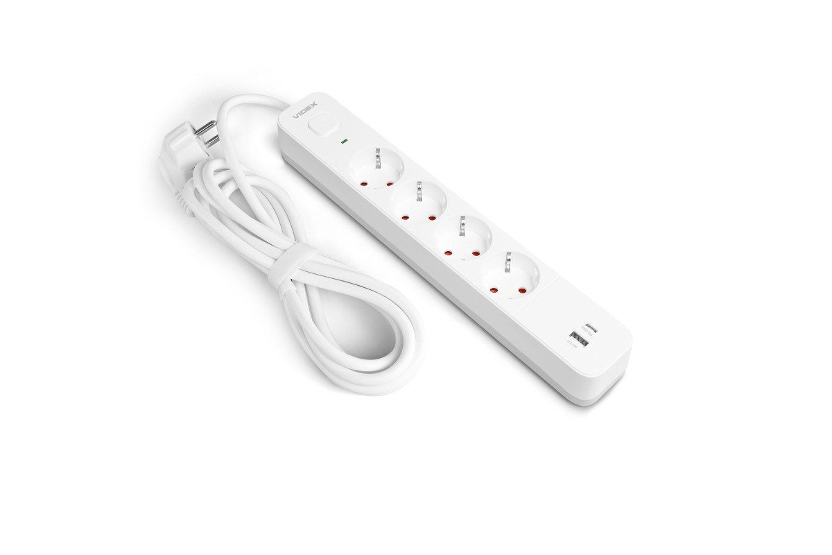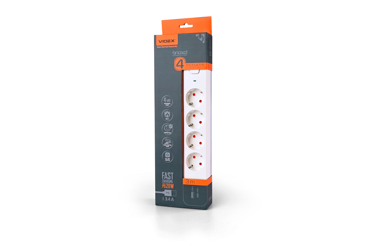 Мережевий подовжувач VIDEX ONCORD з/з 4п 3м (3x1.5мм) 3.4А USB(QC3.0) +USB-C(PD20W) з кнопкою White
