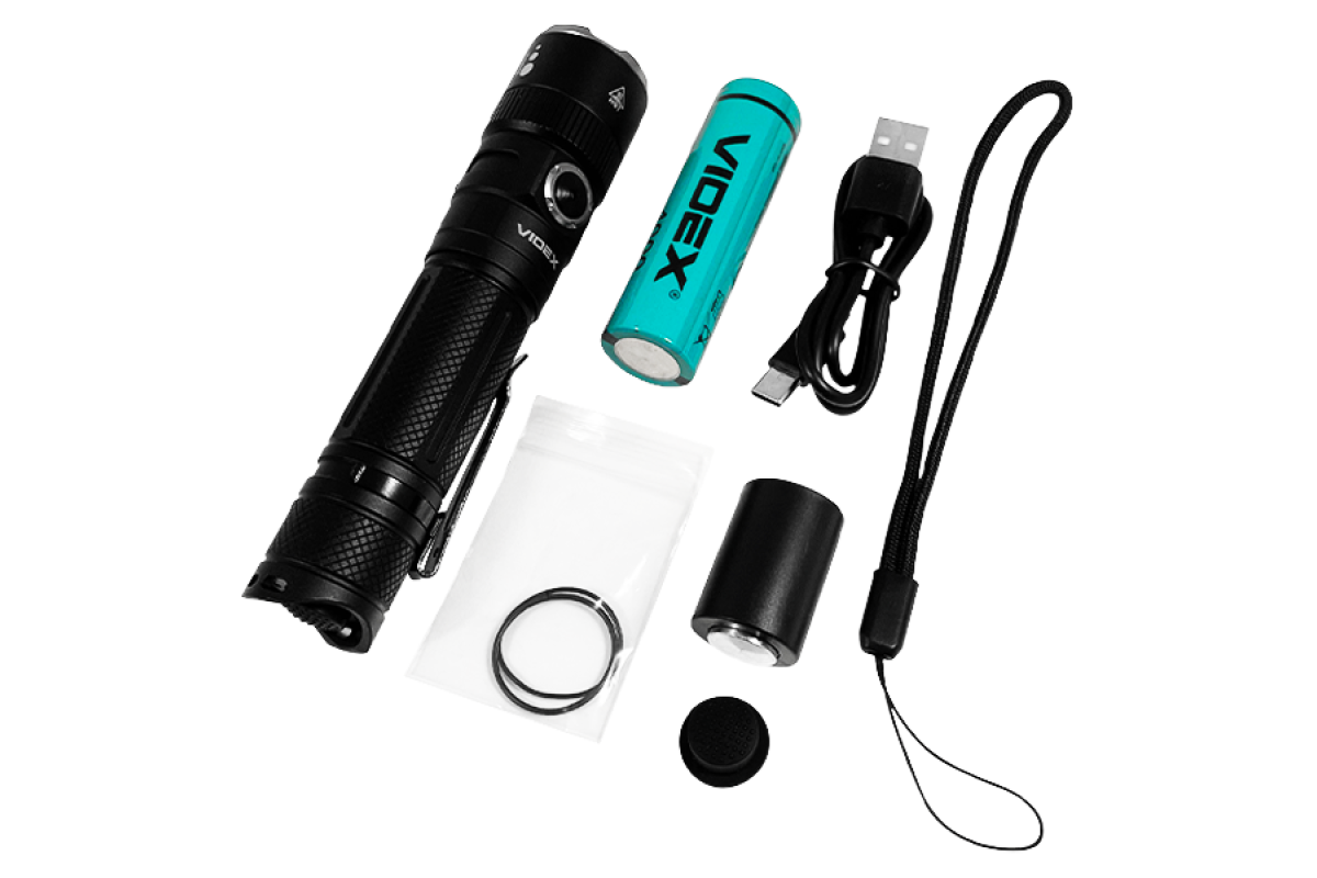 Battery, clip, wrist strap, charging cable, spare seals, spare button cover, seal for 18650 battery, documentation