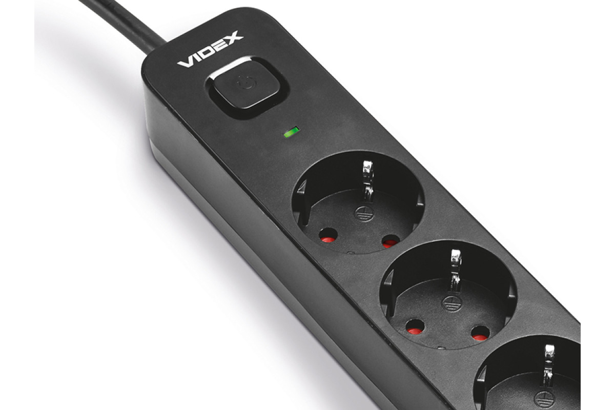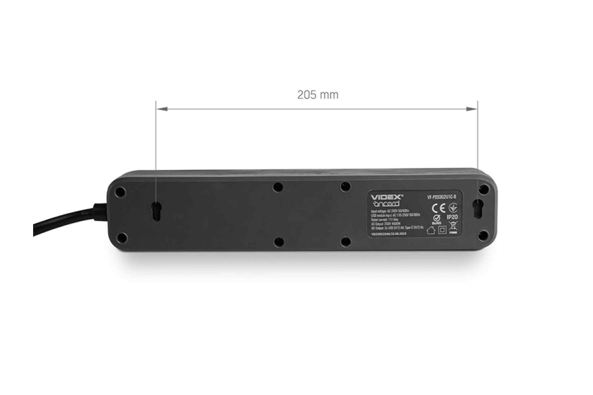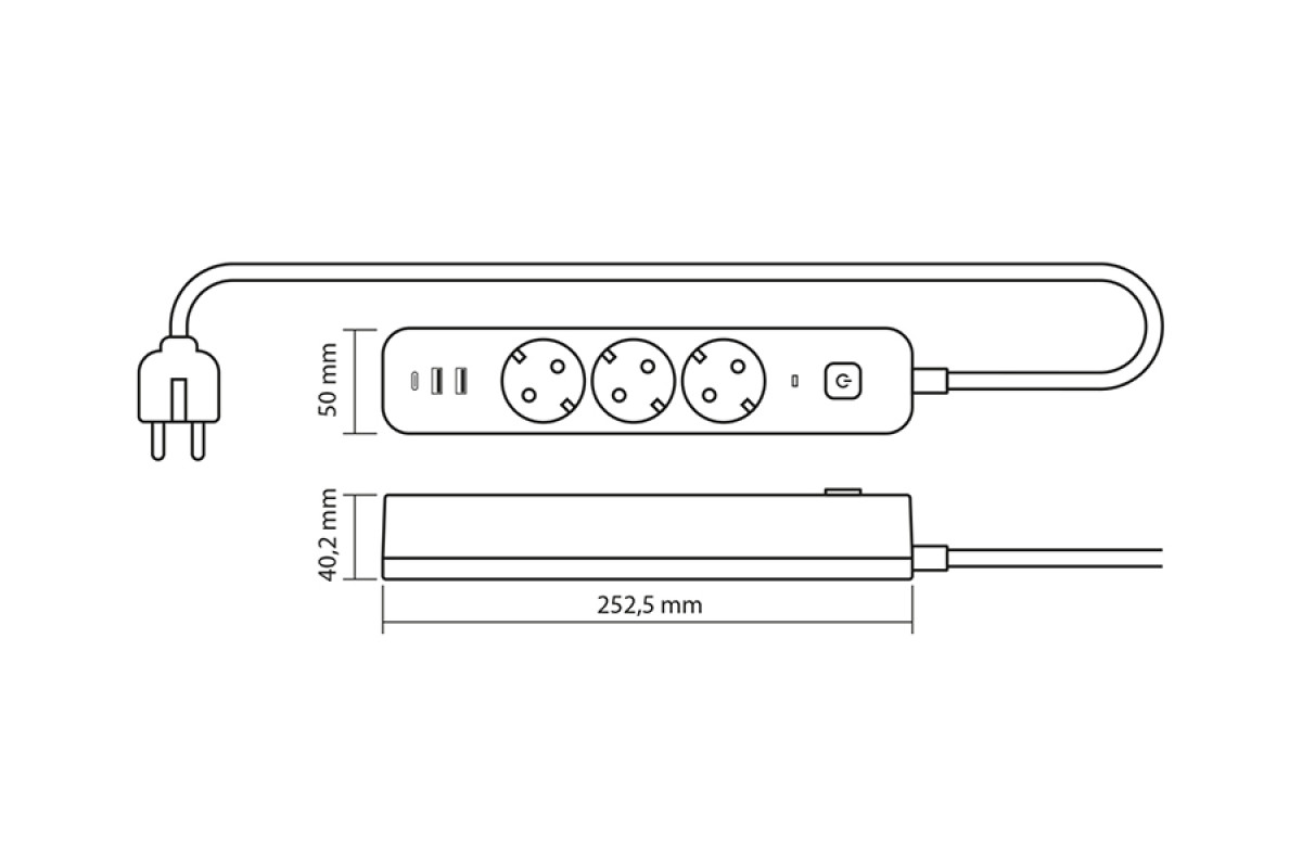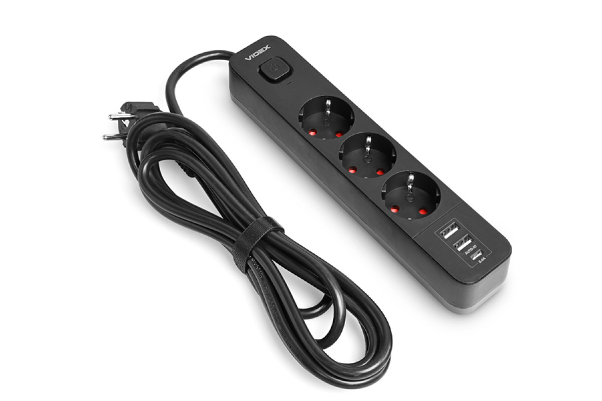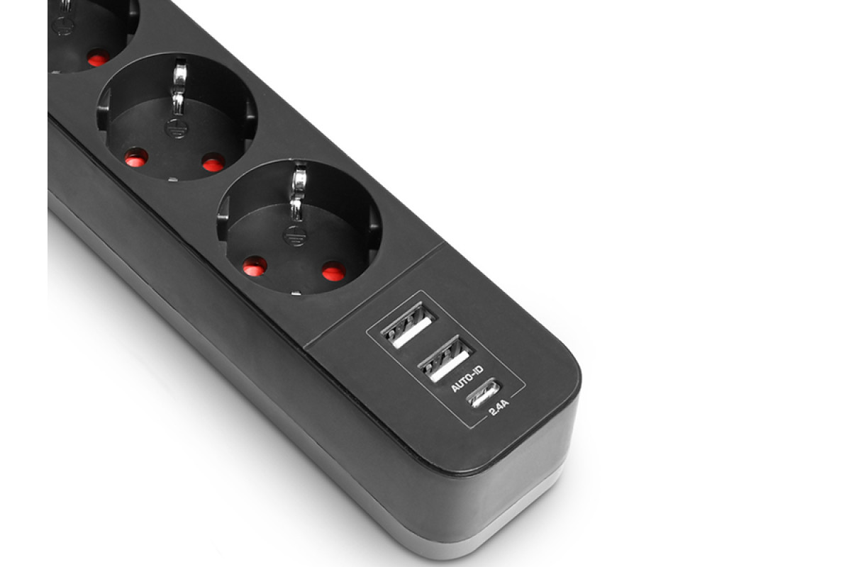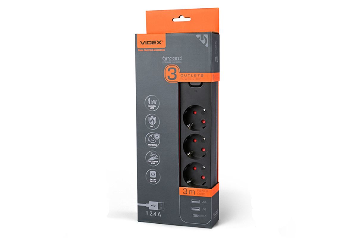 Power extension cord 3p 3m 1.5mm 2.4A 2USB+USB-C with/with and button Black ONCORD (PD33G2U1C-B) VIDEX