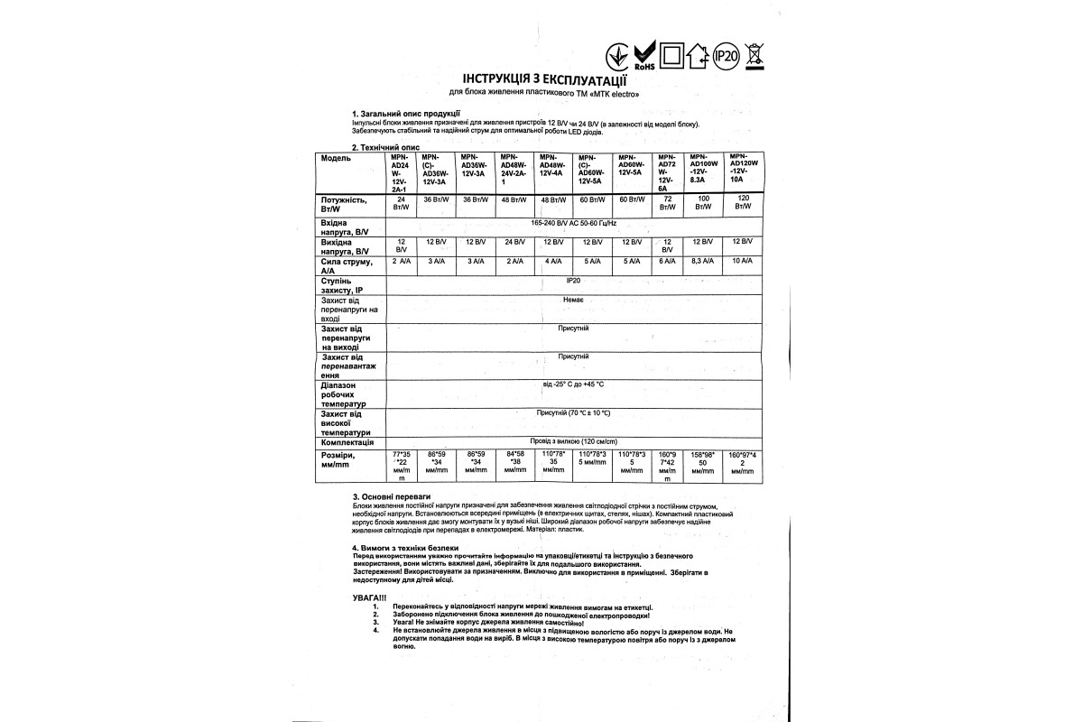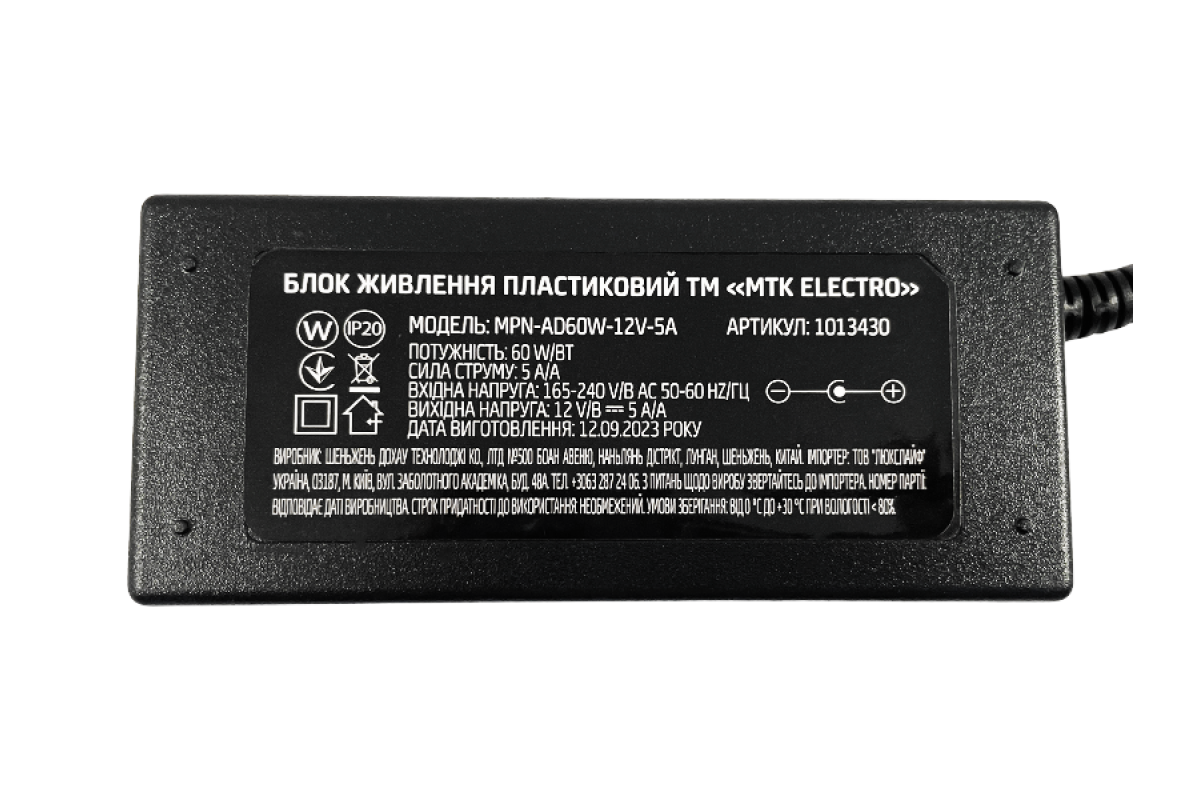 Power supply 60W 5A 12V plastic (MPN-AD60W-12V-5A) (1013430) MTK