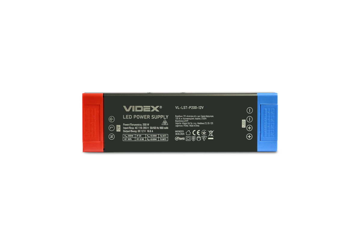 Power supply for LED strip VIDEX DC12V 16.6A 200W IP20 (VL-LST-P200-12V)