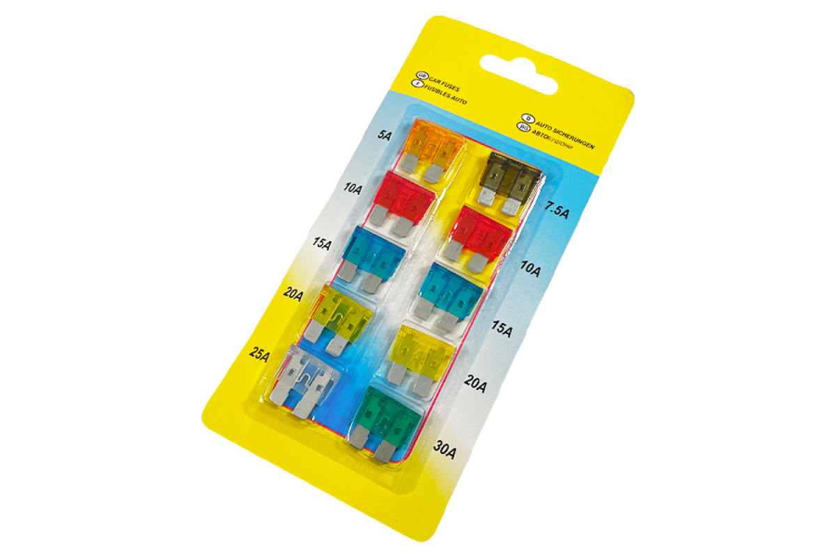 The set includes: 5A fuses - 1 pc, 7.5A - 1 pc, 10A - 2 pcs, 15A - 2 pcs, 20A - 2 pcs, 25A - 1 pc, 30A - 1 pc.