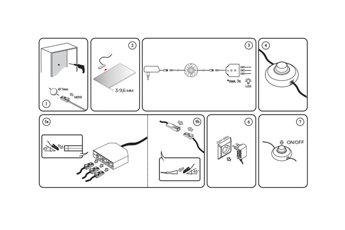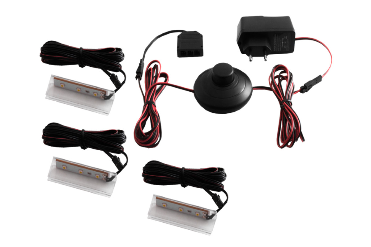 Set of LED clips plastic for lighting glass shelves with foot switch 3pcs 110-240VAC 6 cm blue light, black wire LEDUA