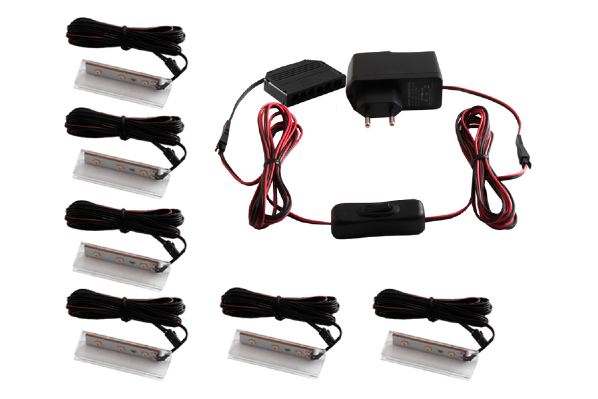 Set of LED plastic clips for glass shelf lighting with manual switch 6pcs 110-240VAC 6 cm warm white light, black wire LEDUA