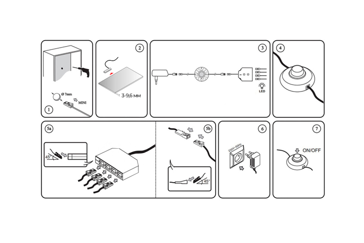 Set of plastic LED clips for lighting glass shelves with foot switch 4pcs 110-240VAC 6 cm blue light, black wire LEDUA
