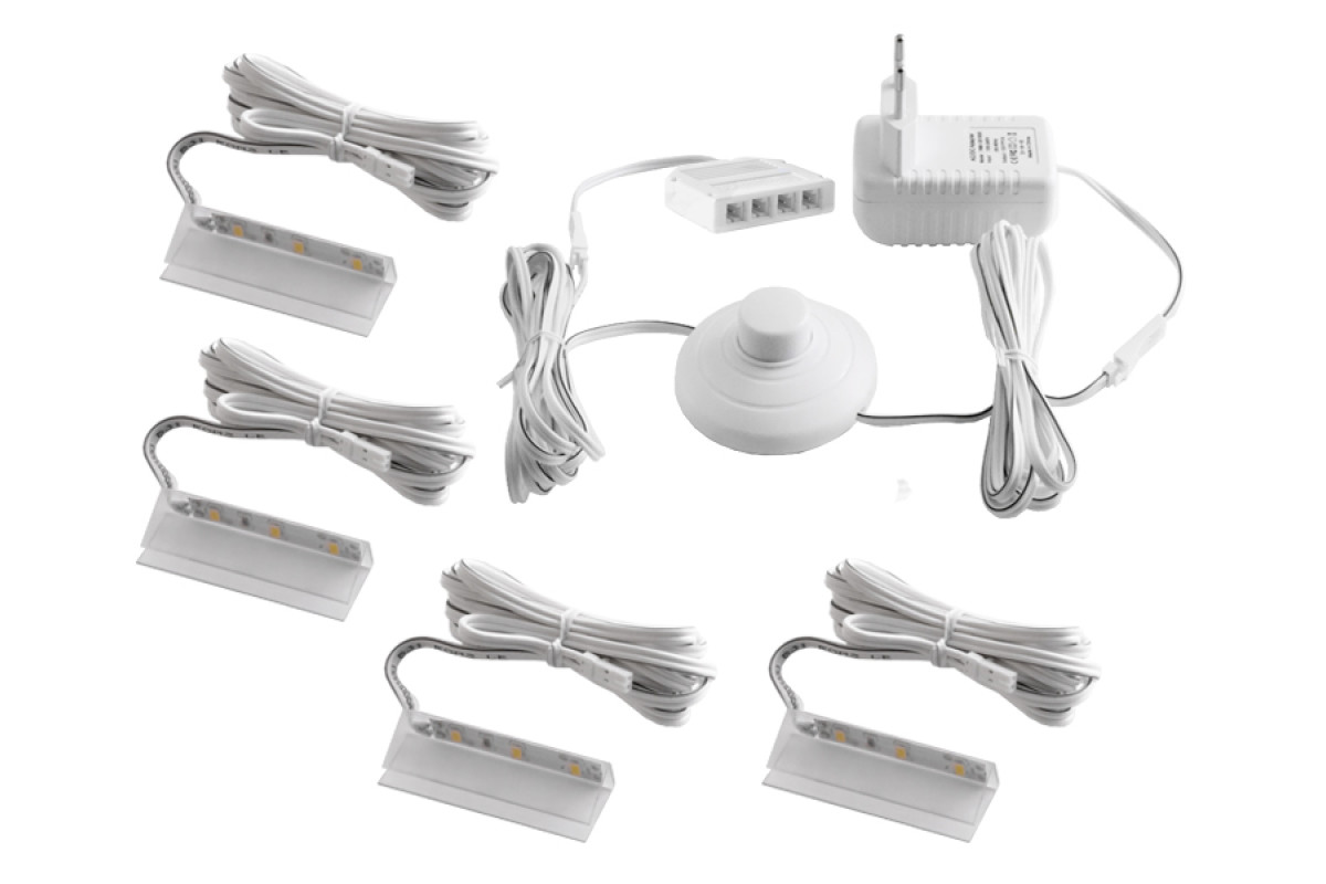 Set of plastic LED clips for lighting glass shelves with foot switch 4pcs 110-240VAC 6 cm blue light, white wire LEDUA