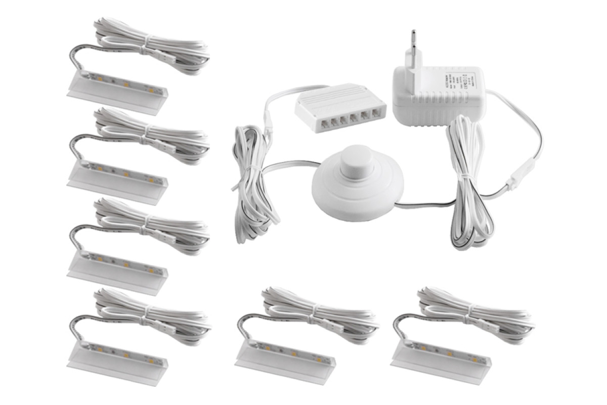 Set of plastic LED clips for lighting glass shelves with foot switch 6pcs 110-240VAC 6 cm blue light, white wire LEDUA