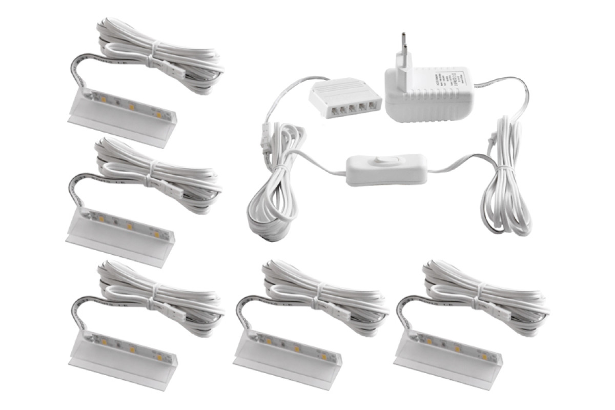 Set of plastic LED clips for lighting glass shelves with manual switch 5pcs 110-240VAC 6 cm white light, white wire LEDUA