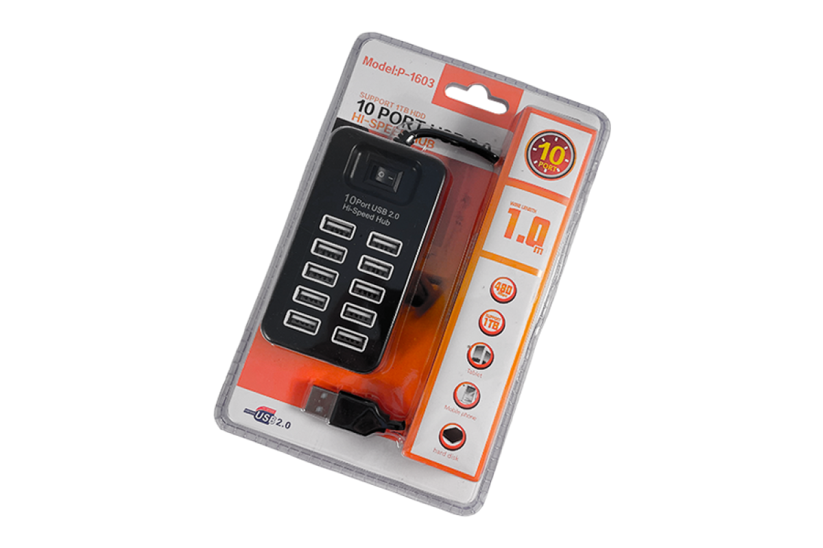 USB HUB with 10 USB 2.0 ports with switch (Model:P-1603), in blister, 4-1090, active